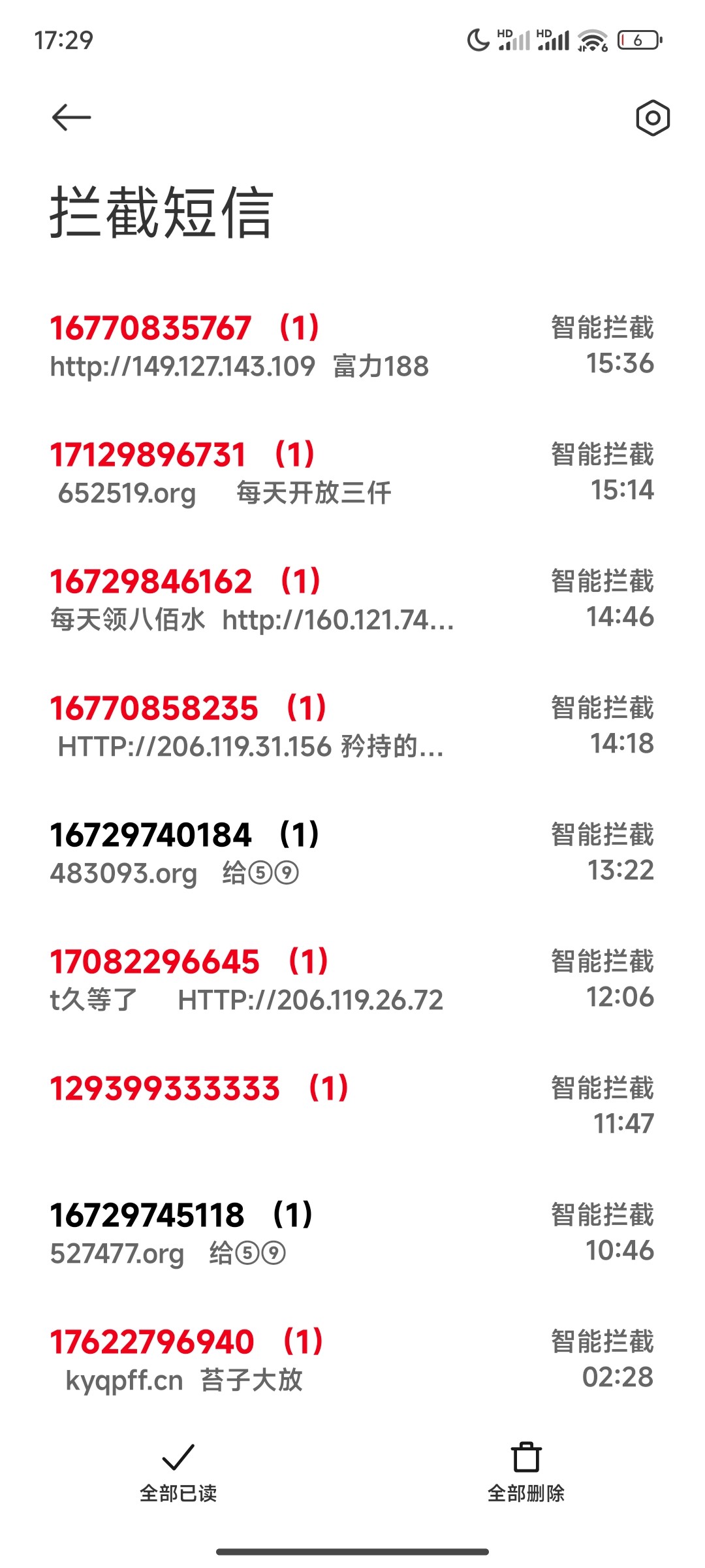一天最少上百赌条短信电话。没以前那种短信说送就送的了