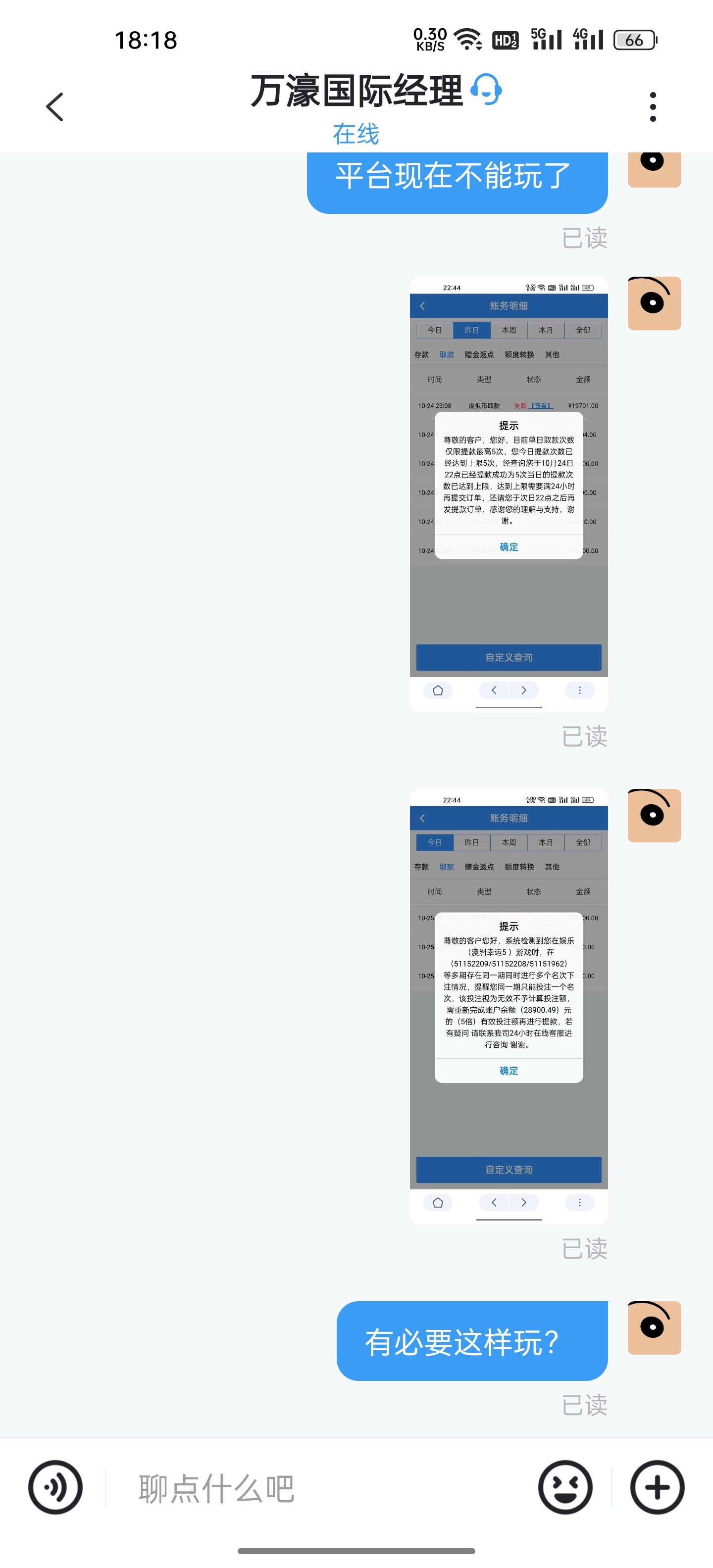 网du现在别玩了,全在黑了,10月份咖聊的万濠国际和68体育也黑了10多万,都是18年19年注册的老用户,充值都充值了几百万,现在提几万说黑就黑了
