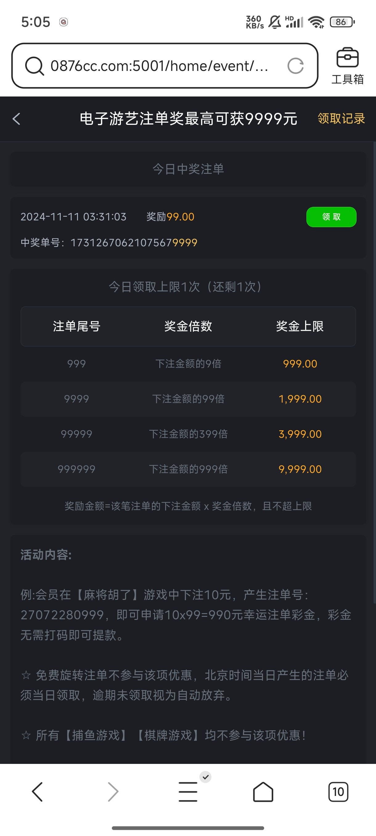 没号,注册去打了100+59,提了200,打LG电子还出了个幸运注单,提现到账美滋滋。