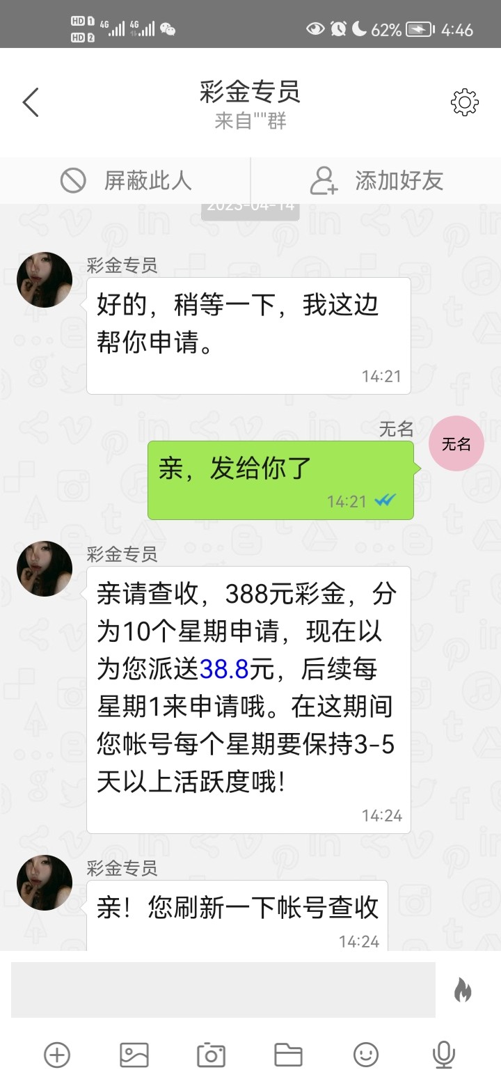 现在一分彩金不送了,你冲完之后叫你提款找他,提完款之后要你每周活跃三天在找他送38.8,第一周也要活跃三天。