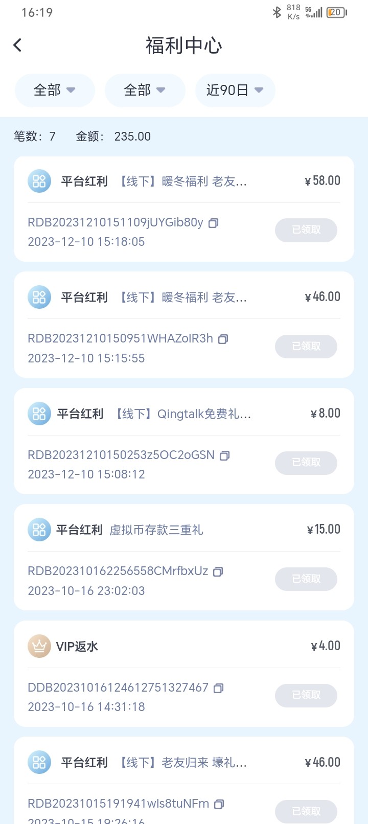 不知道是巧合还是什么 这帮狗庄不是最近换了个客服软件么 从M talk换成了Qmtalk 我前两天接到了江南还有博鱼电话 然后看到论坛别人发的开云联系方式 我就去碰瓷说接到电话了 客服回复说没有免费彩金 然后刚看论坛老哥发的帖子说开云回馈 我登录上去发现福利中心有58 就是昨天晚上派送的 叫暖心活动老友回馈 我问了在线客服 说是电维彩金 6倍水