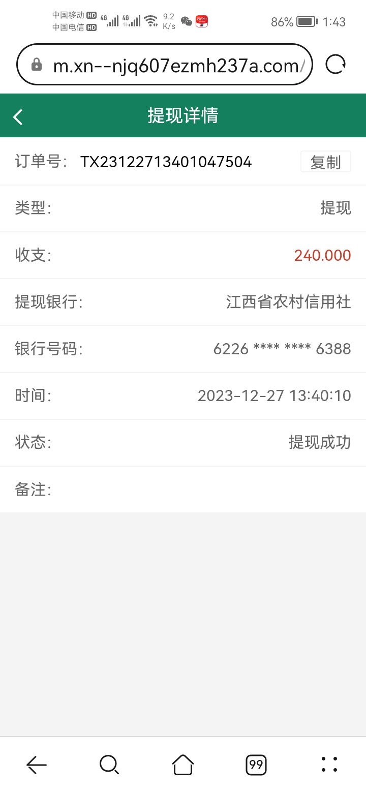 提现几分钟就到账了,还有两个手机号