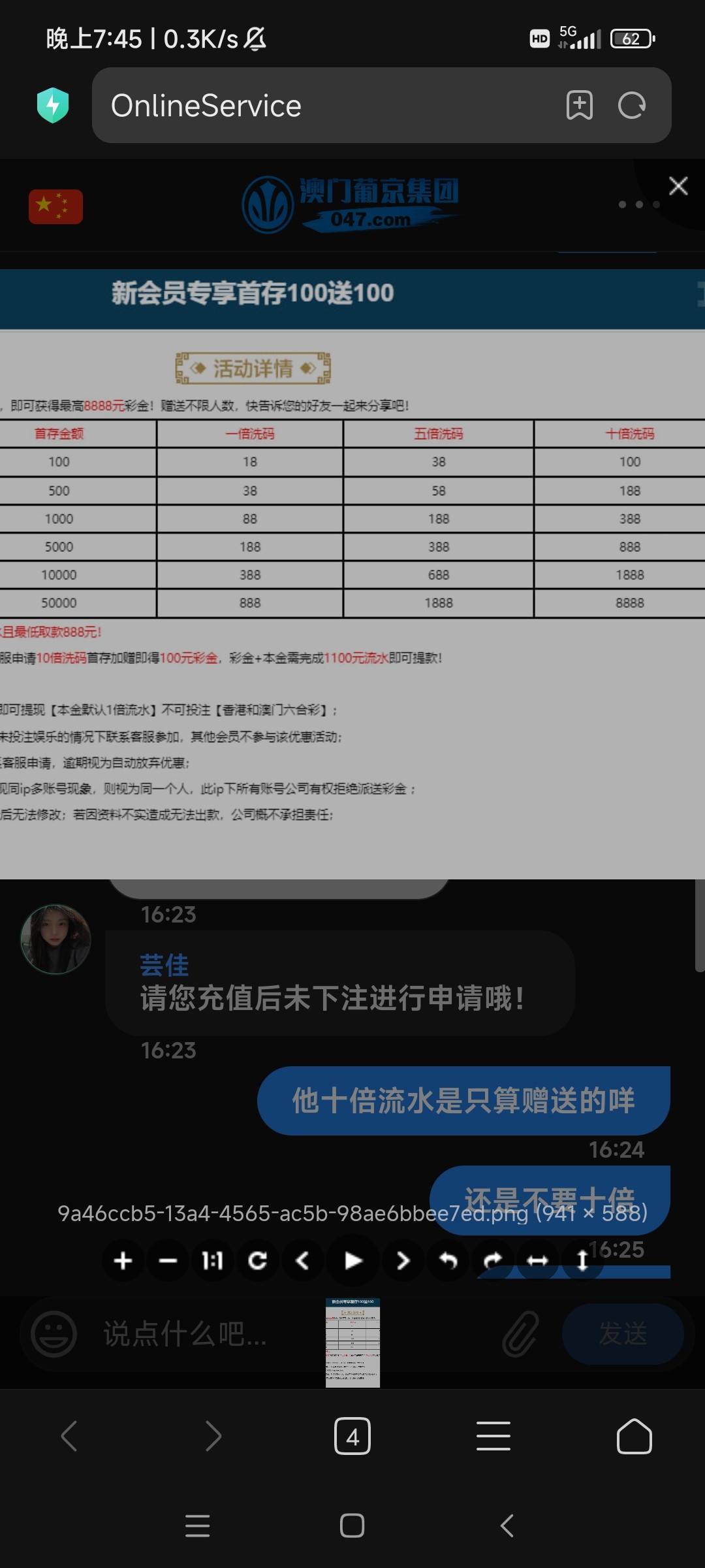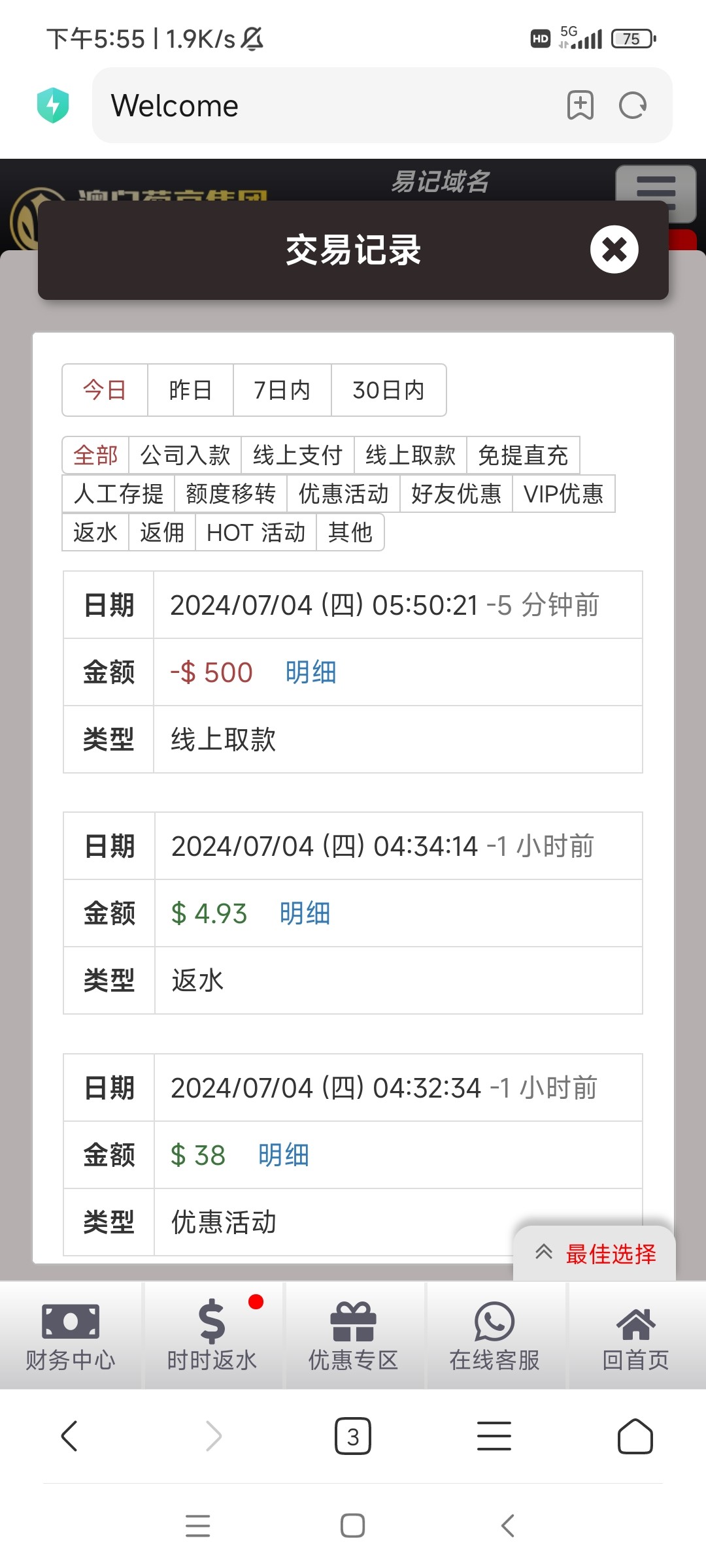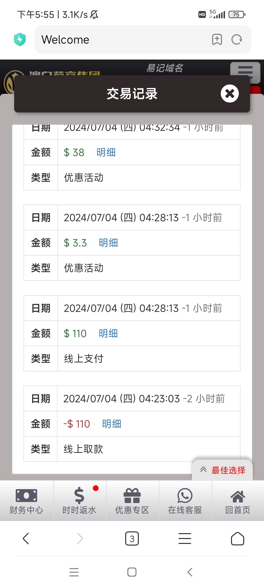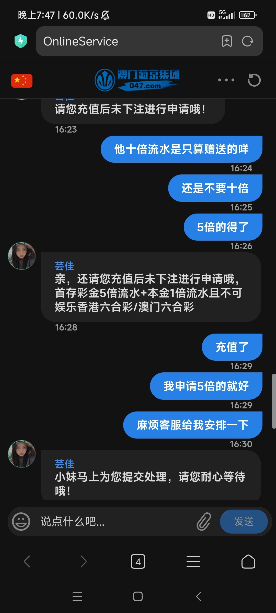 网站047.com。打电话特邀送21天,每天18。第六天终于提了100。反水冲个首存。又下500。合计白嫖500大洋
