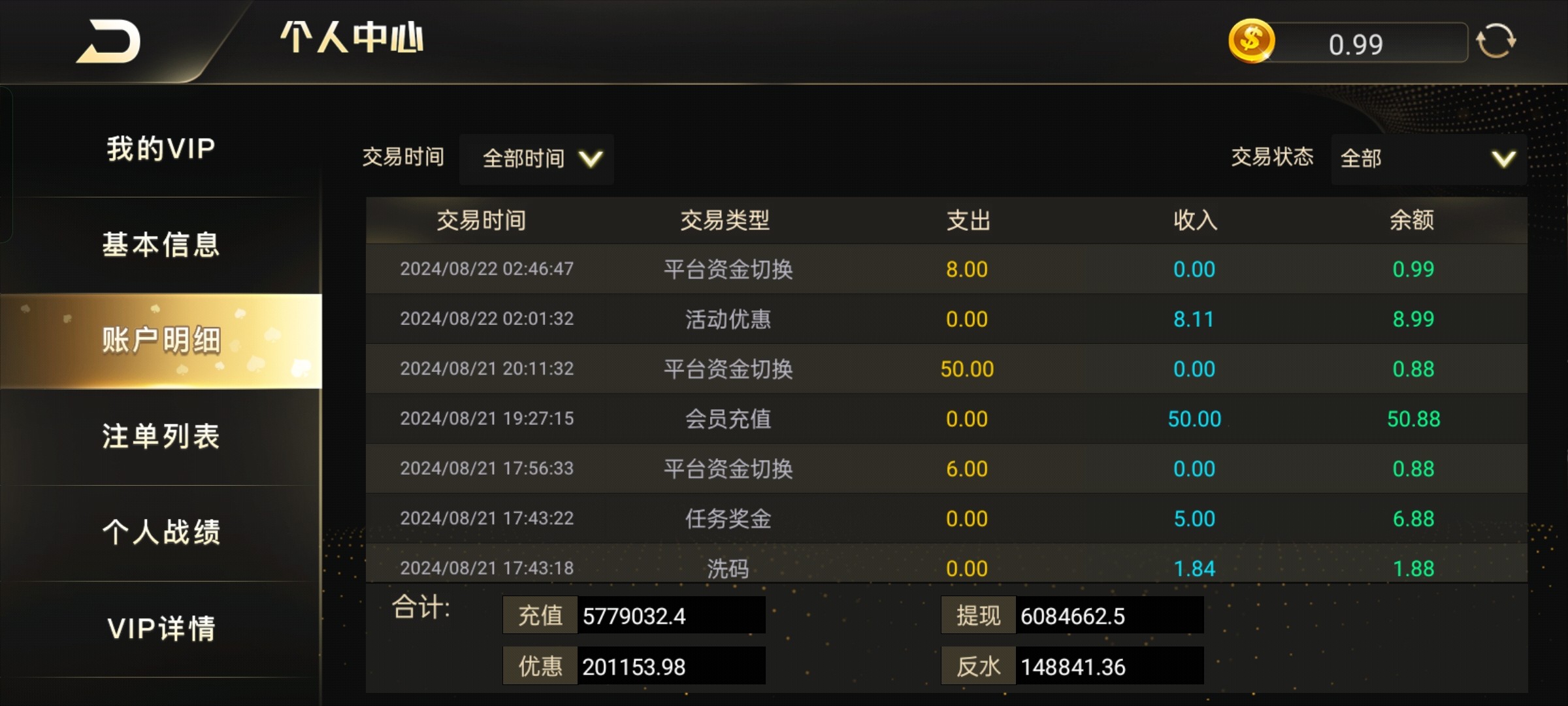这种台正常10几年的台了除了捕鱼号玩点,电子就是假的,我一个v9号充了13w多,玩5年提现都是秒到,去年用彩金打到5500多水是封控单注异常要审核,审核了7个多月今年4月份给我解开的但是要充值5500,后面我想着v9号每个月可以领500多块钱然后就充值了,1倍水只提了6000多块钱,然后系统把我每天签到给关了反水也是给关了