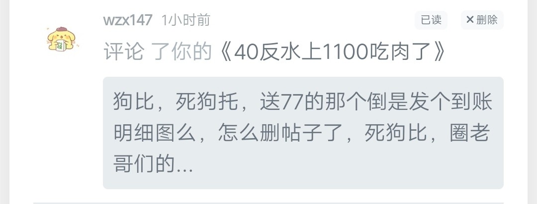 另外一位更有意思,我40反水打1100,发了个贴这货恬不知耻的要我来团饭,反问他立马删了回复,气急败坏开始攻击,这里比隔壁还有特色,隔壁是素质不好到处骂人,这里不仅素质不好还恬不知耻,乞丐也多,真是活久见。