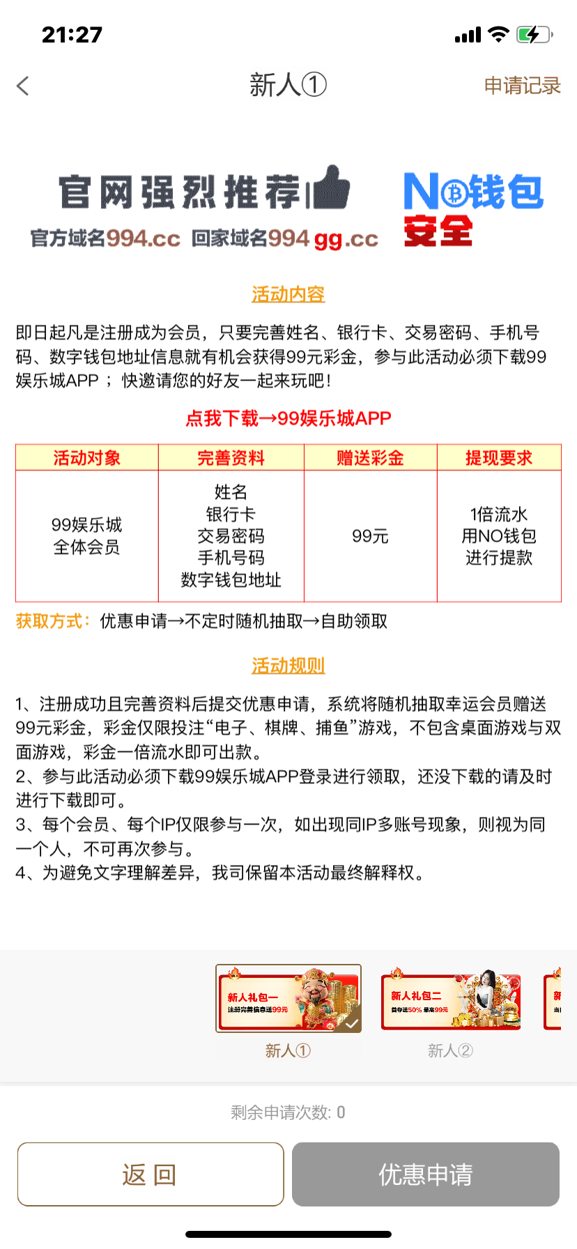 994.cc,新用户注册可以申请99彩。我申请到了没打出来