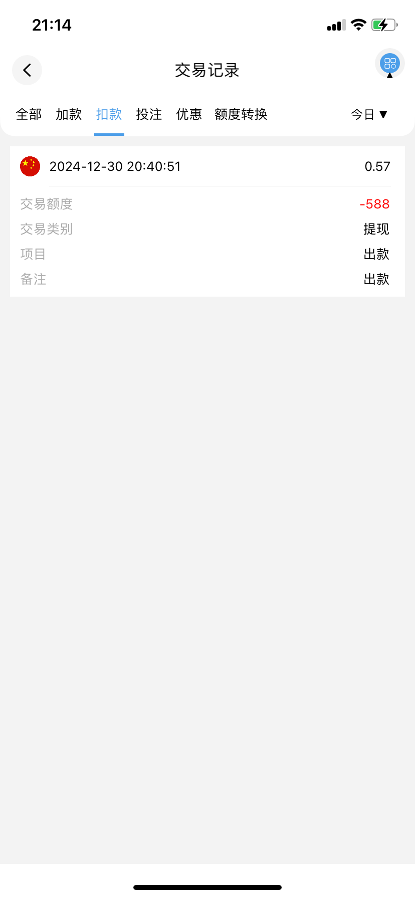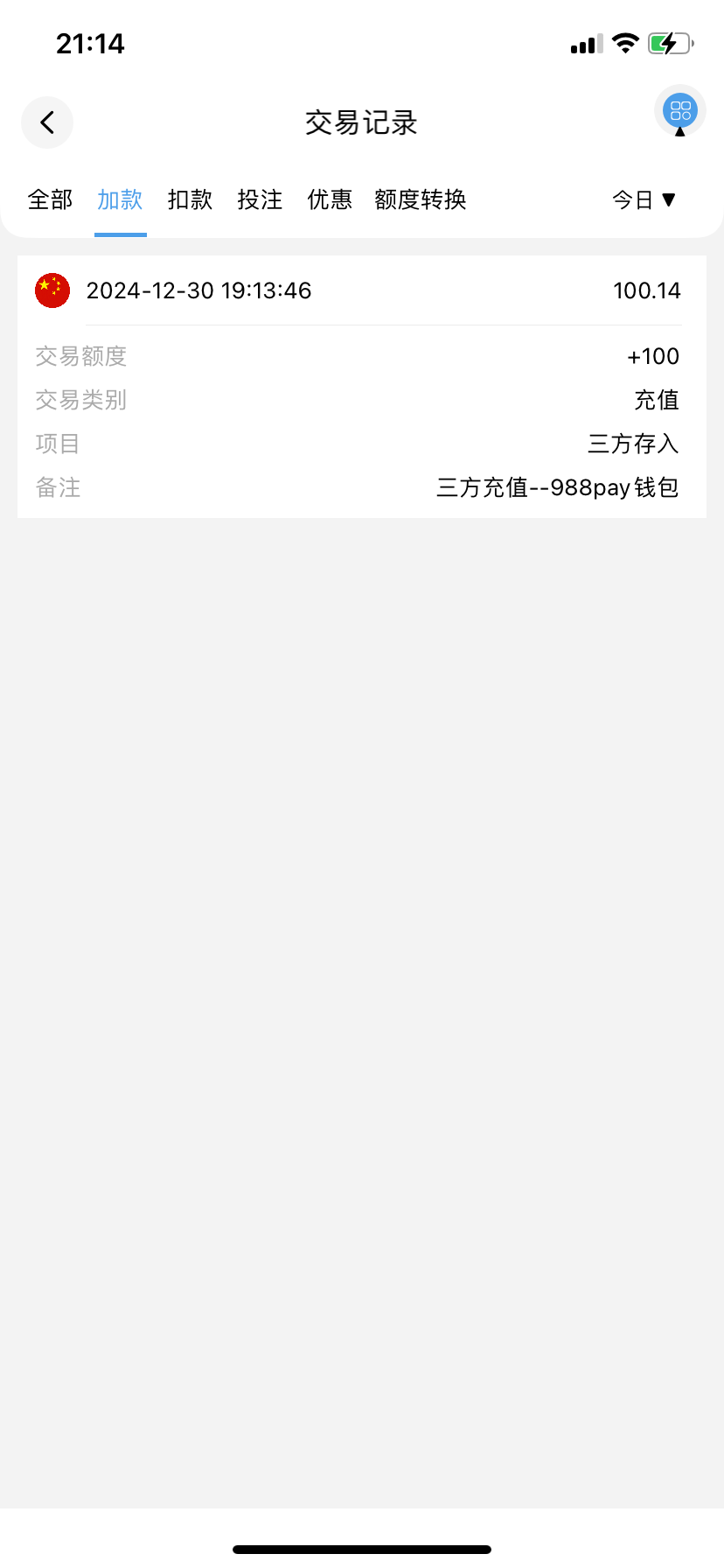 留钱能地址,前天本来想发有事取消了。今天论坛曝光过的HG13皇冠给我打电话,充100送100,限电子,5倍流水,最高最低提588,麻将有点水,提了588搞6个牛子,我提的988币,但是钱能有钱,所以留钱能