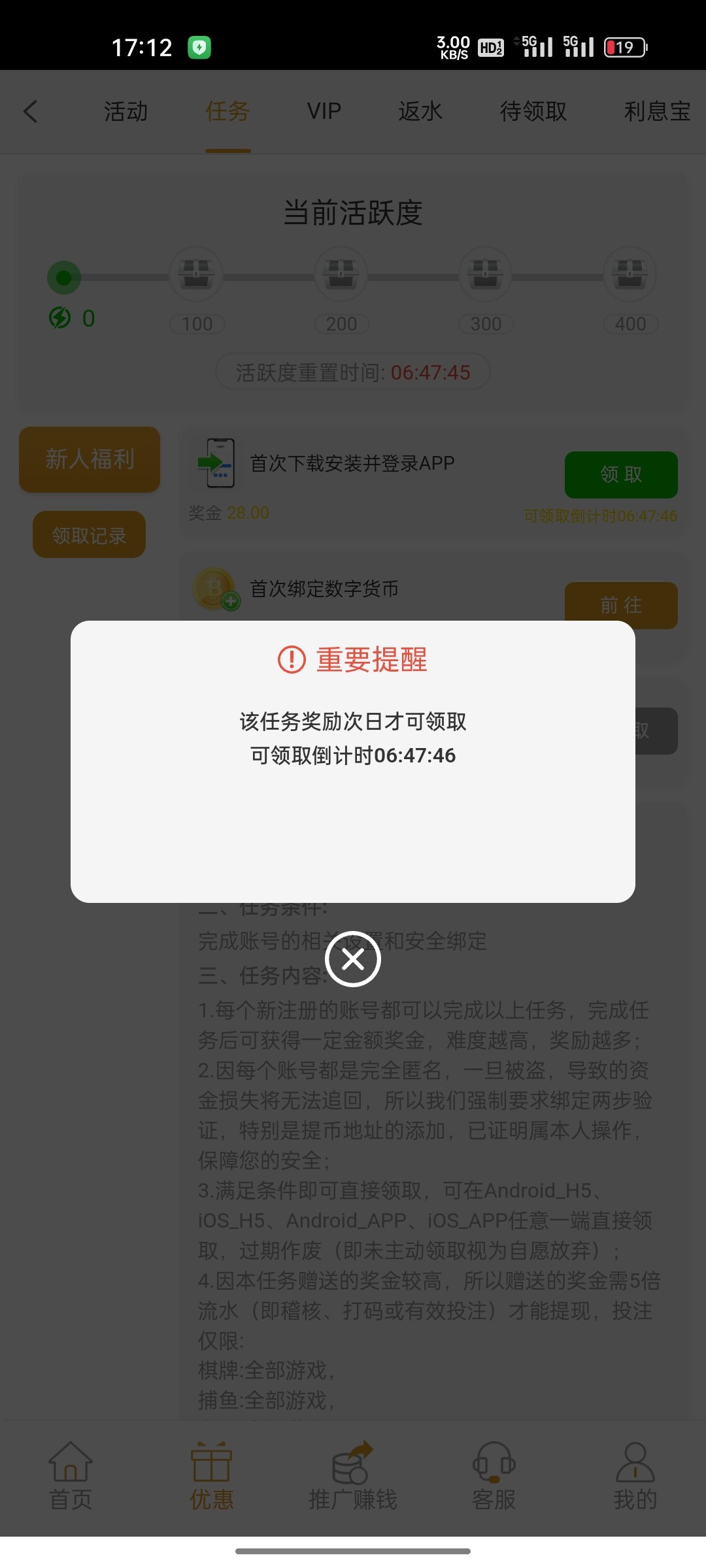 微信好友申请给的网址, 不知道要不要特邀,注册下载app登陆然后在网页领取任务彩金,有就有没有就没有吧。