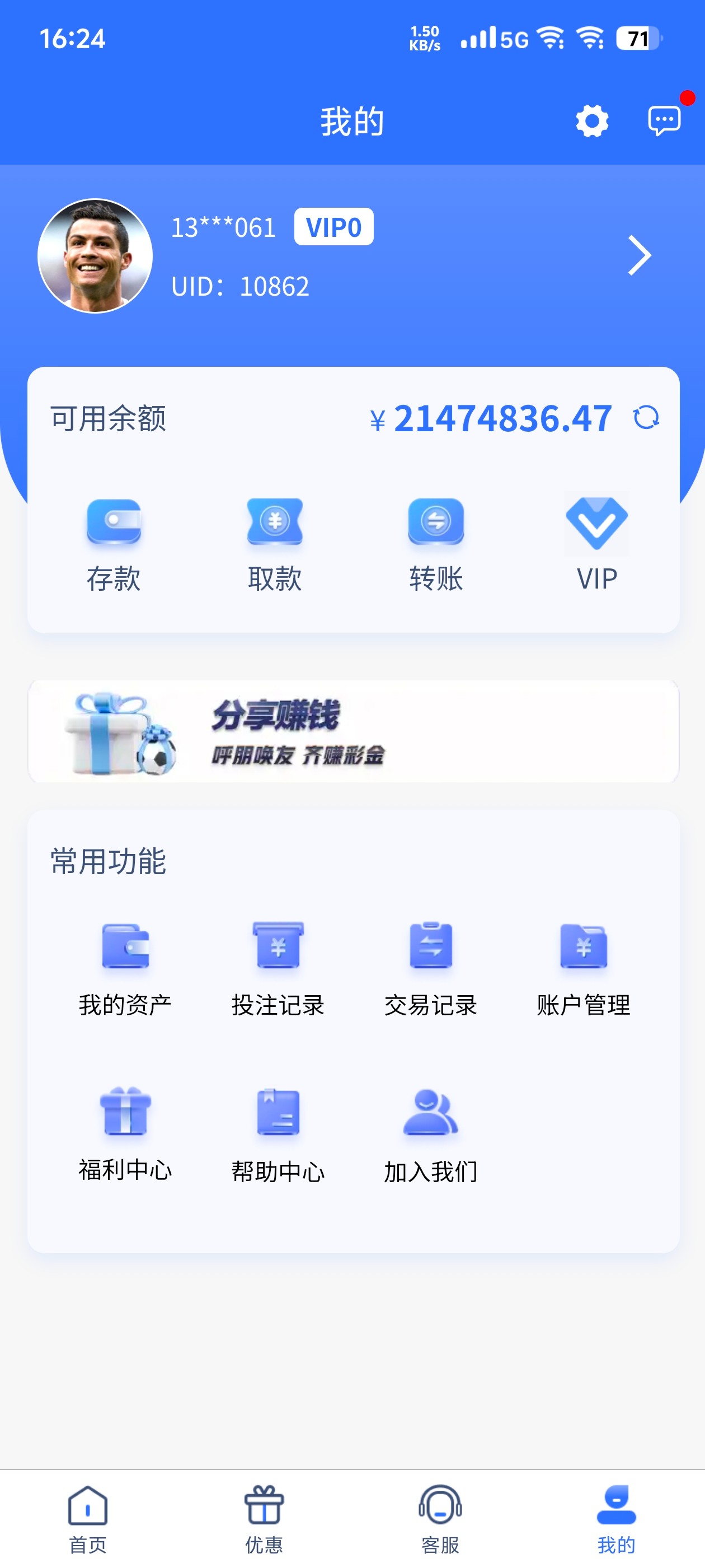 新用户注册绑定信息,福利中心自助领取彩金,彩金限制自行查看吧,具体自测吧