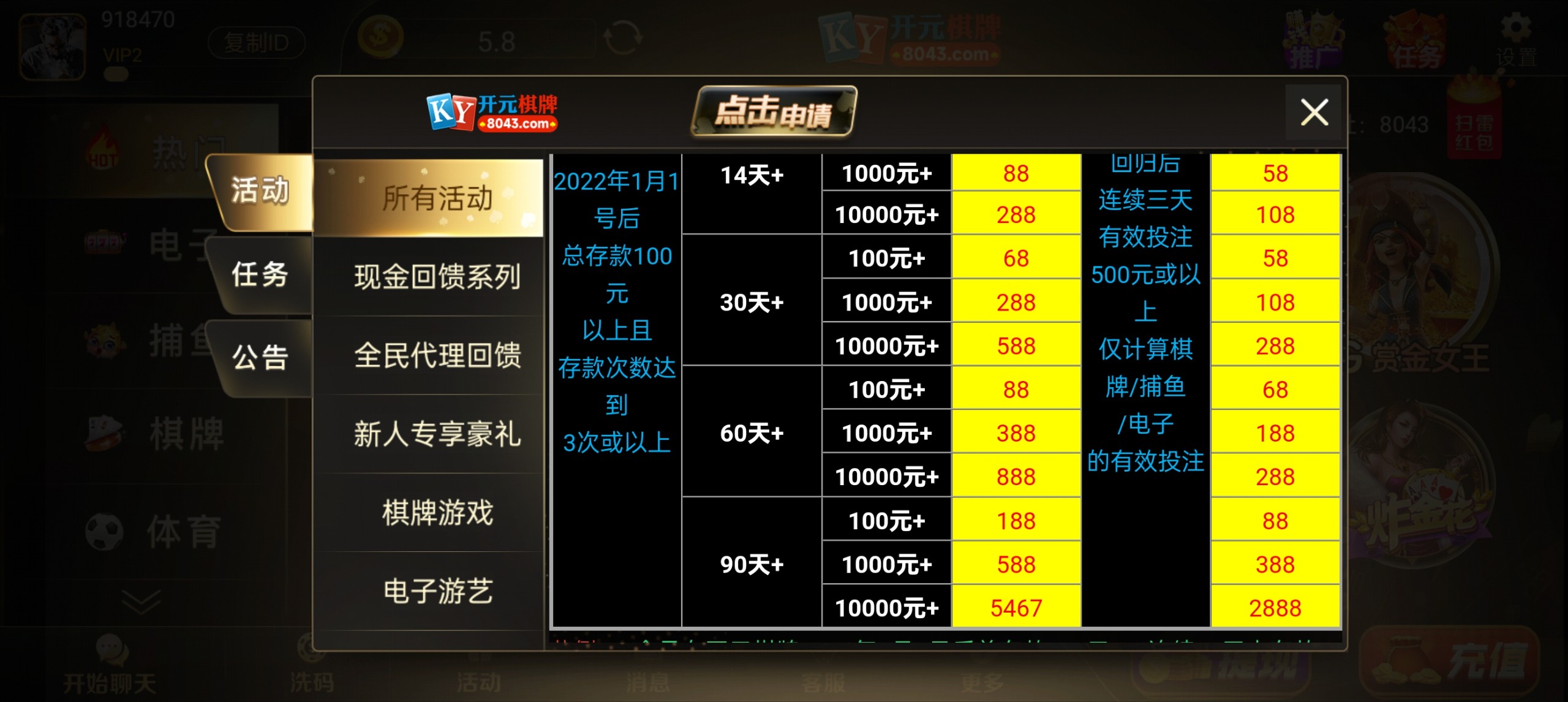 这种模板小额不会黑,但是申请要以前充值过,有的平台玩不起,你365天没充值过,它给我申请的是180天的活动