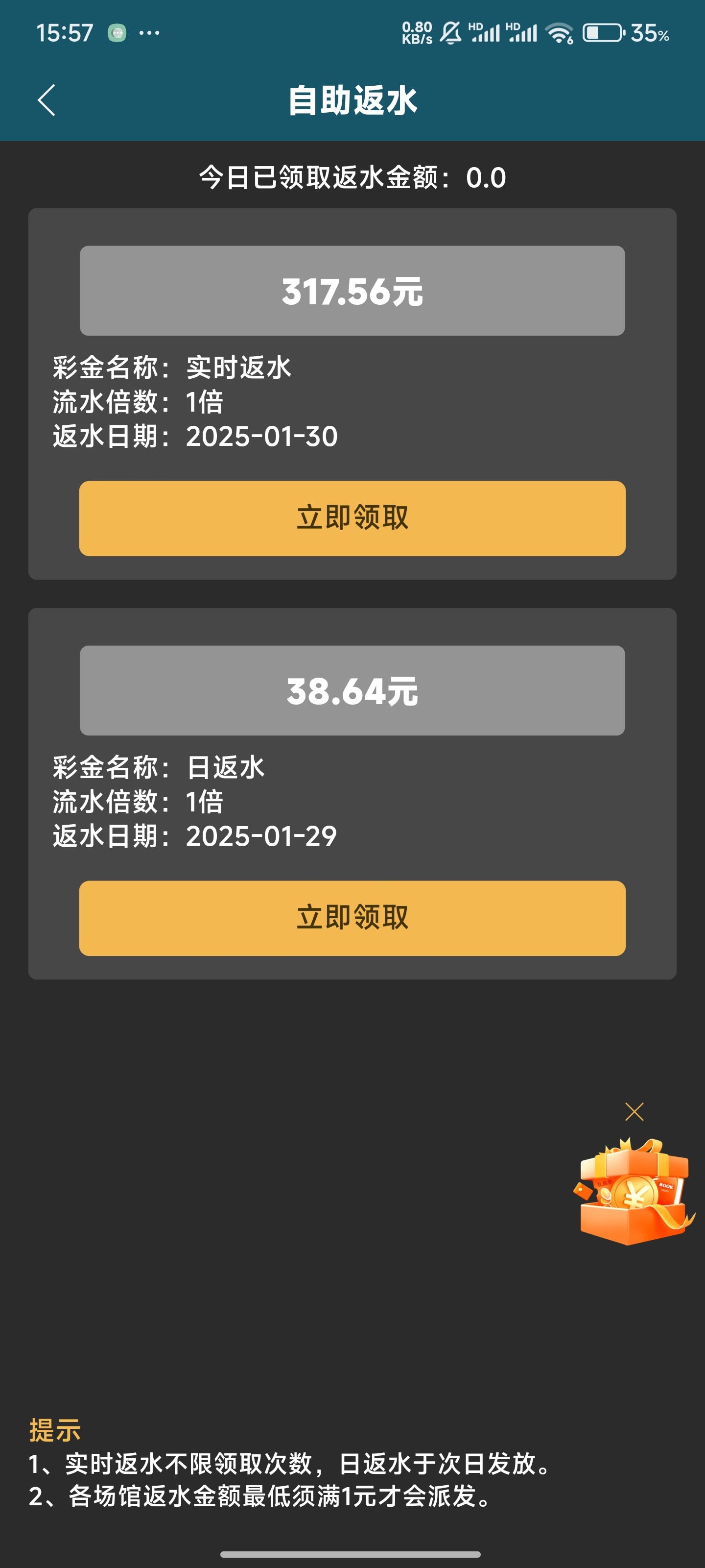 打这个存送没买过一次免费,虽然他没说不能买,我觉得还是拉出来的免费水大
