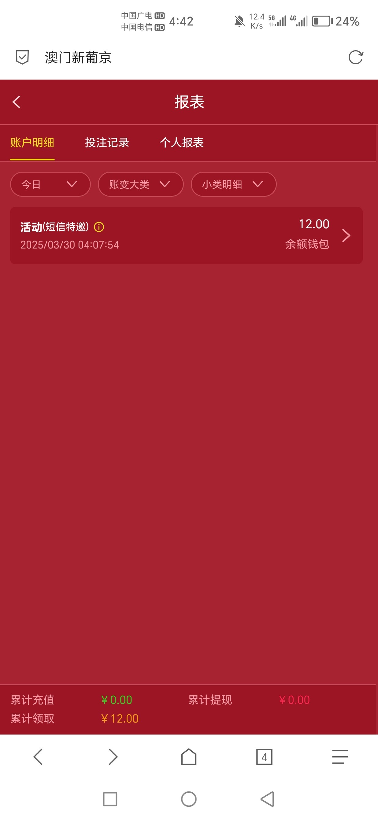 注册登录联系客服 发手机号和ID 领取电话彩金/特邀彩金 过一会余额自动到12