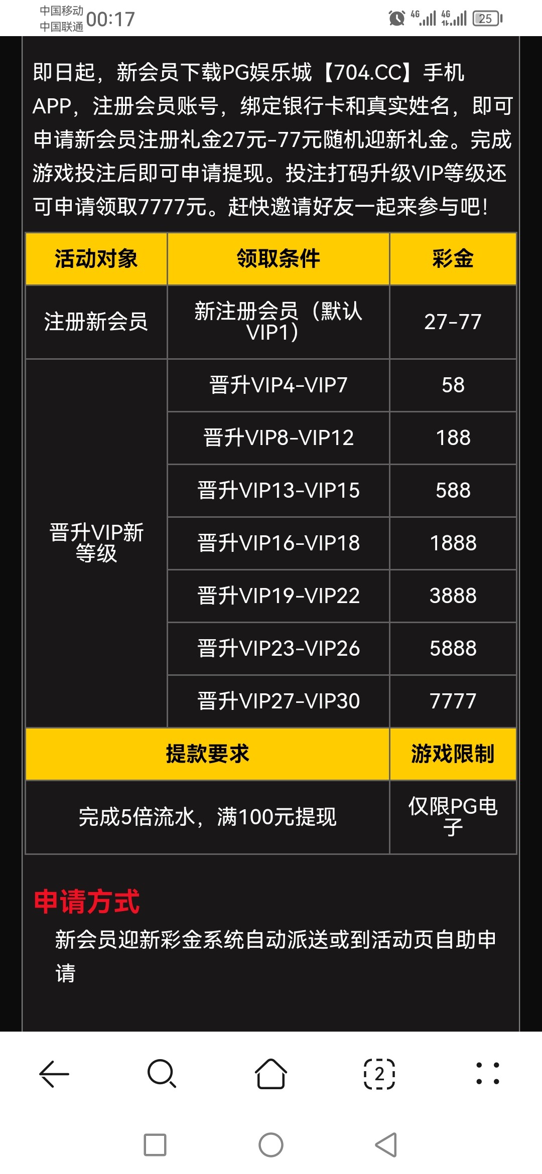注册绑定信息优惠里面自助申请,几分钟到 只能玩PG电子 5倍水 满100提 我没打出来,申请不到的老哥就当没看见,别张嘴就喷,谢谢