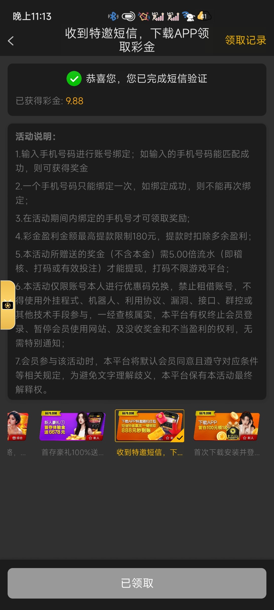 最多出180,多的可以藏分提,都出款了,我玩的棋牌其他的彩金只能电子或者捕鱼,这个新人彩金不限制