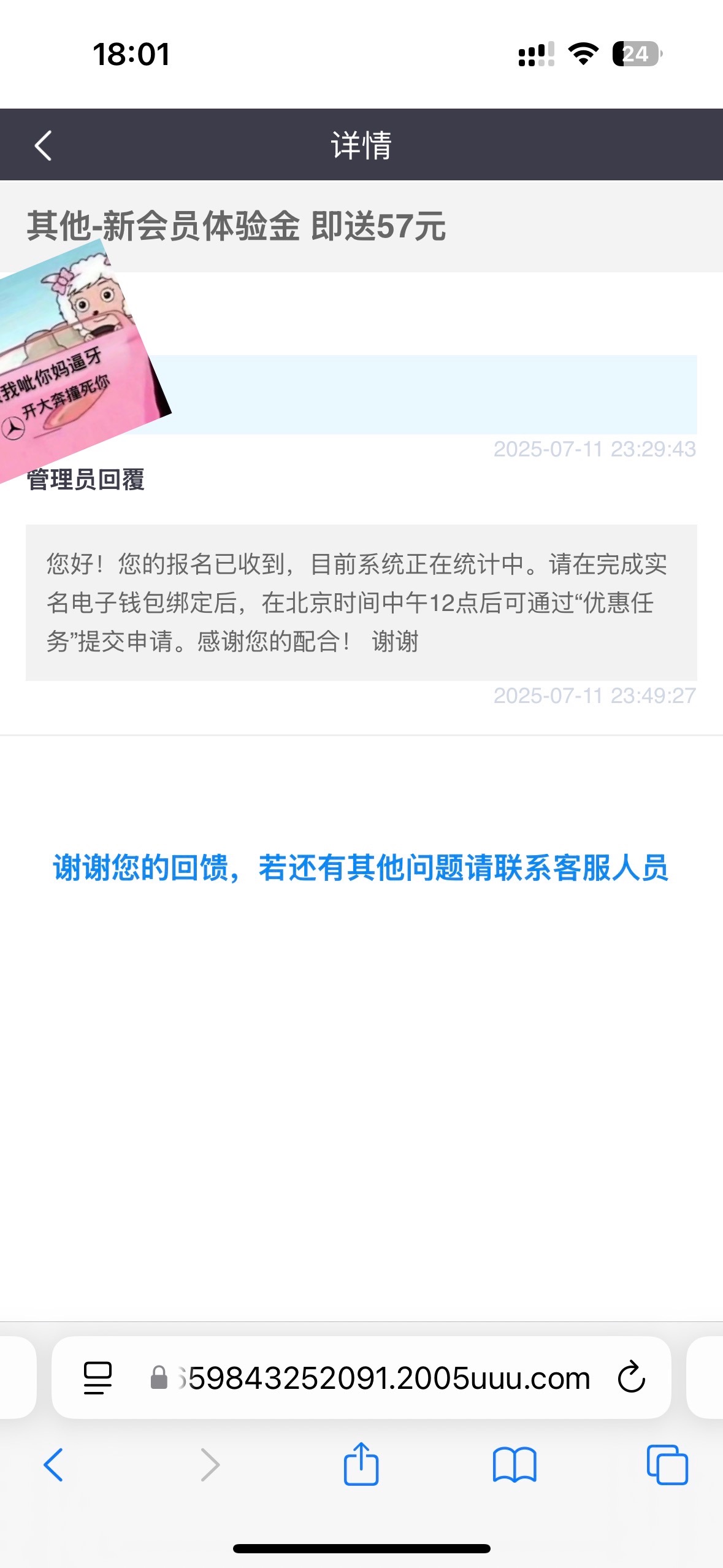 申请方式,点我的-意见反馈,选其他-主题 新会员体验金 即送57元,内容填账号就行
