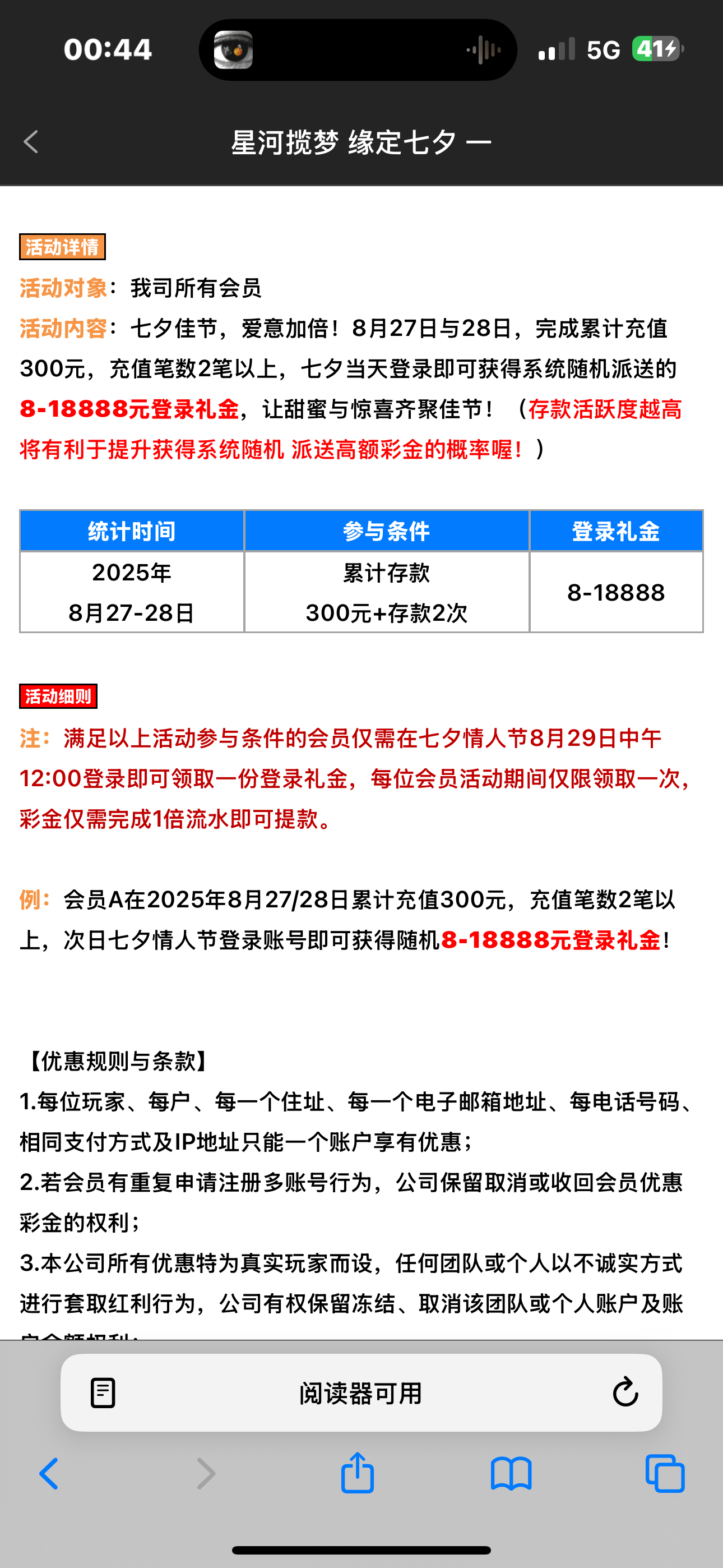 这个七夕彩金要不要上看情况吧 27-28号累计充值300就有8-18888 之前是送了388 应该有点格局  台子有50+50新人 小额三万以内我是没被黑过 看自己要不要上吧
