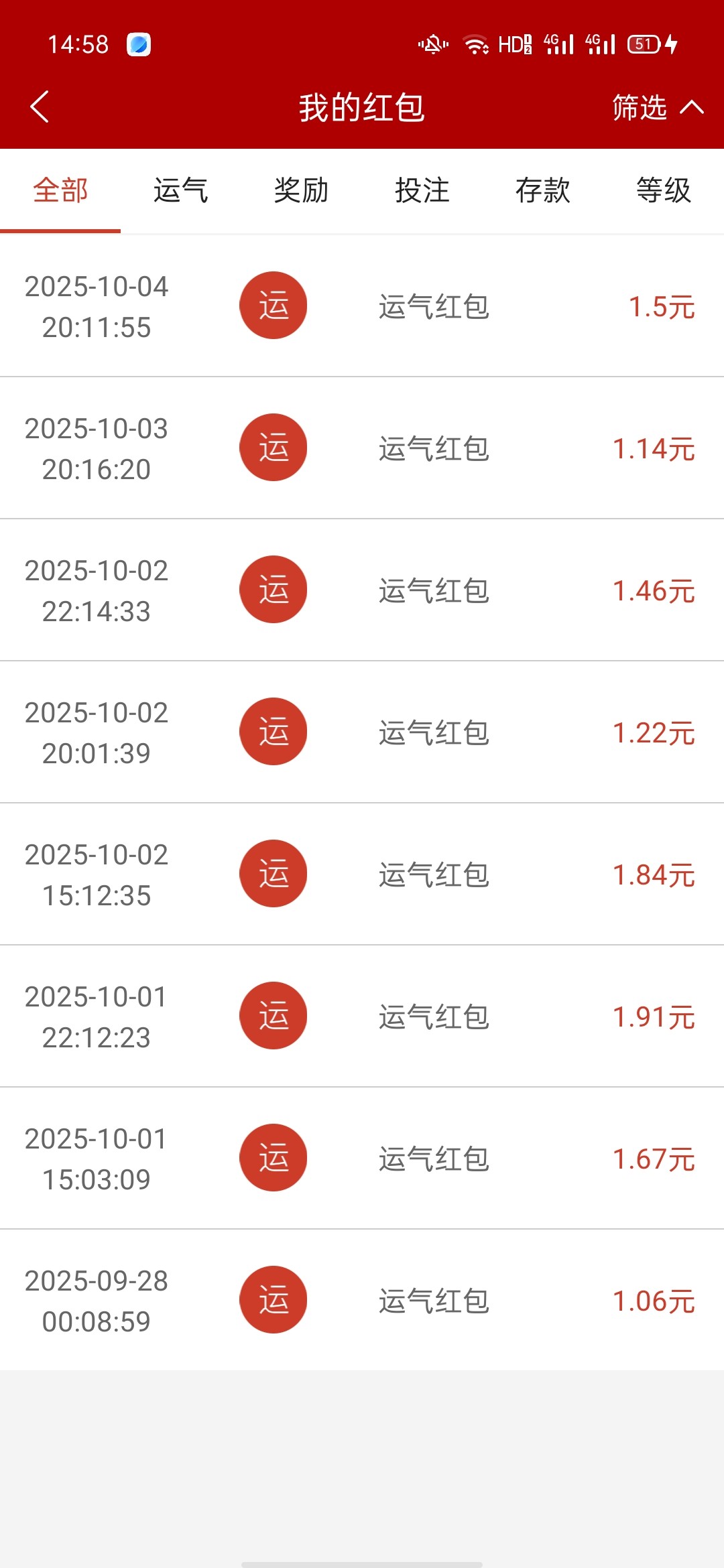 你自己倒霉吧,我三块五块这样子,然后偶尔一两块,有节日一半都是六块九块这样