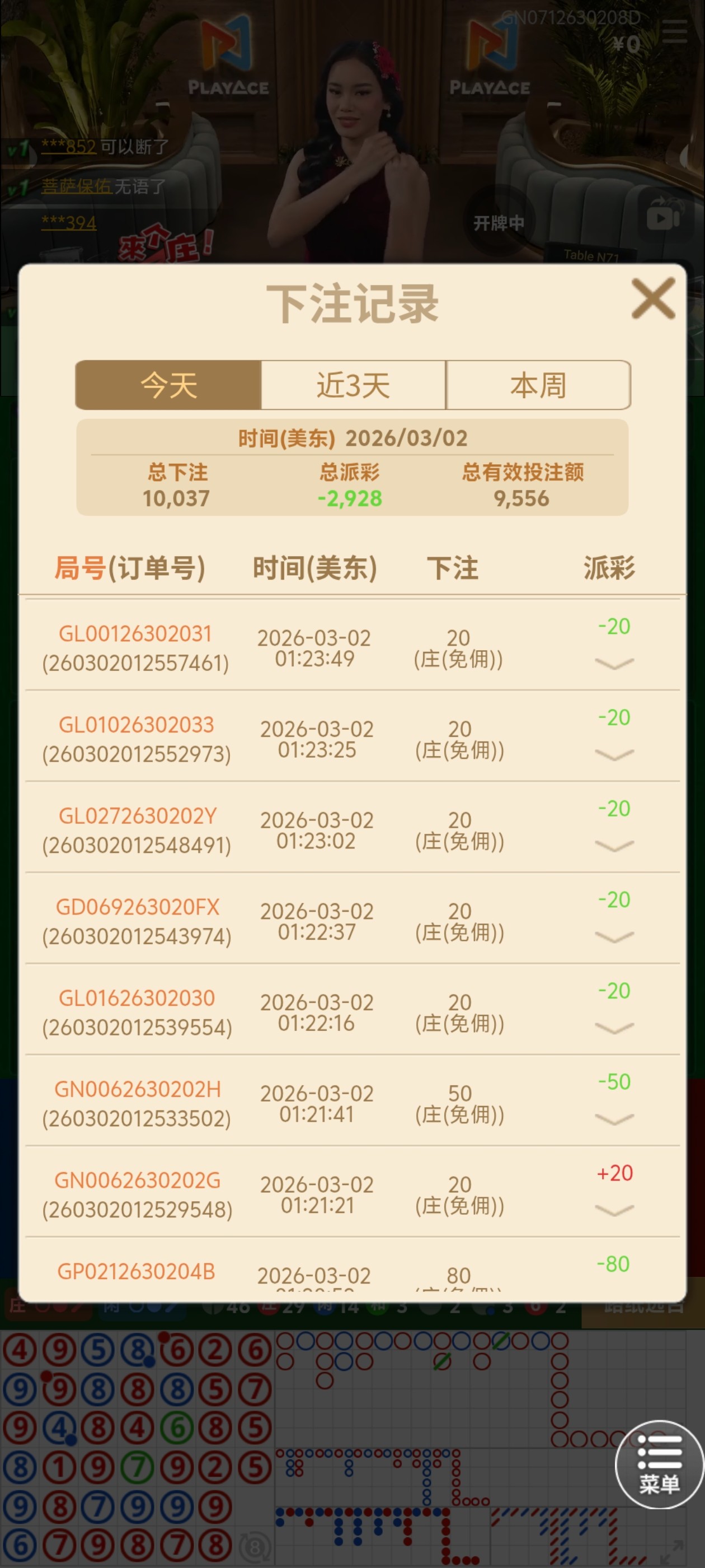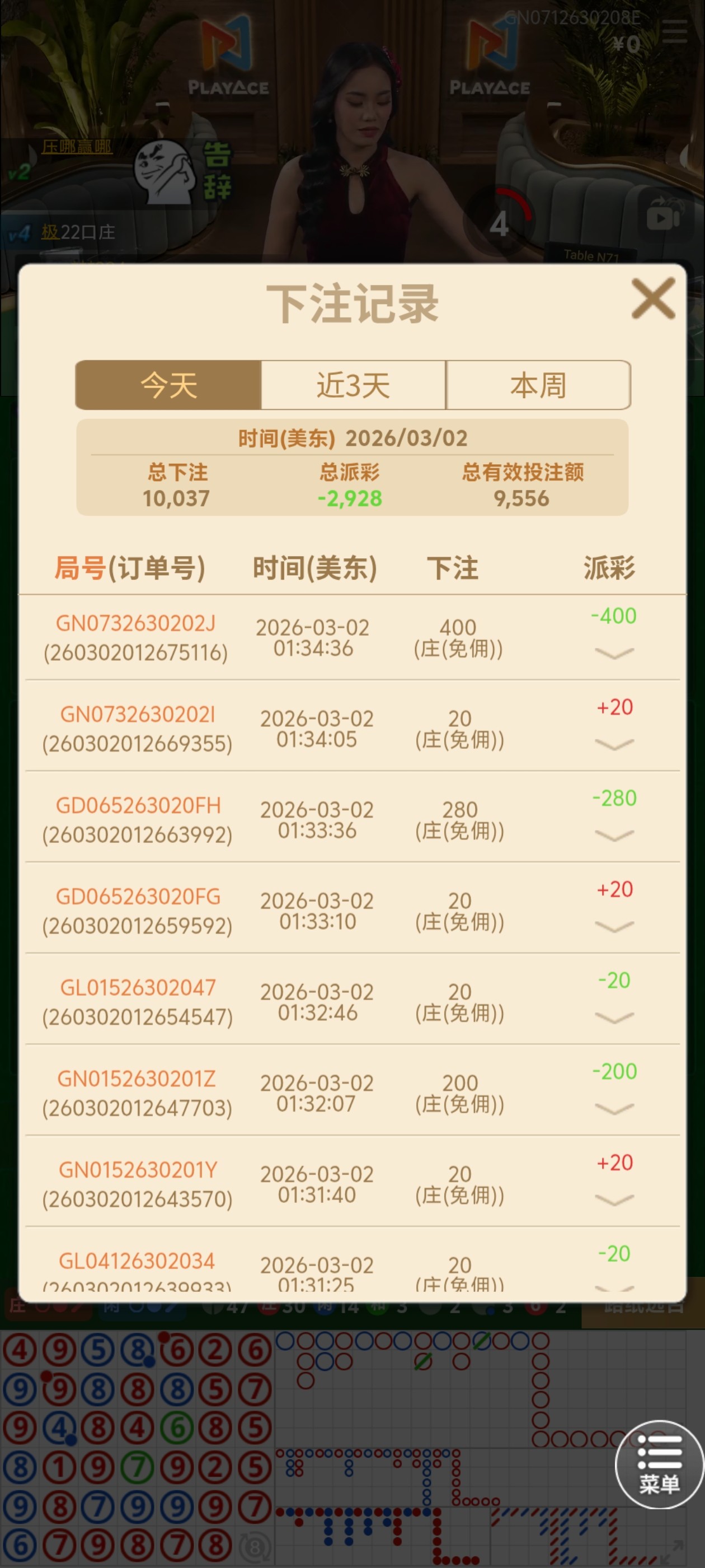 打20块的注码都能输3000,百家乐真的很难赢啊,而且我还没有反龙,你们看后面,20块赢,200输,20赢,400输,而且前面连黑的时候,我打的还是20块,后面20赢,投注大一点还是输。