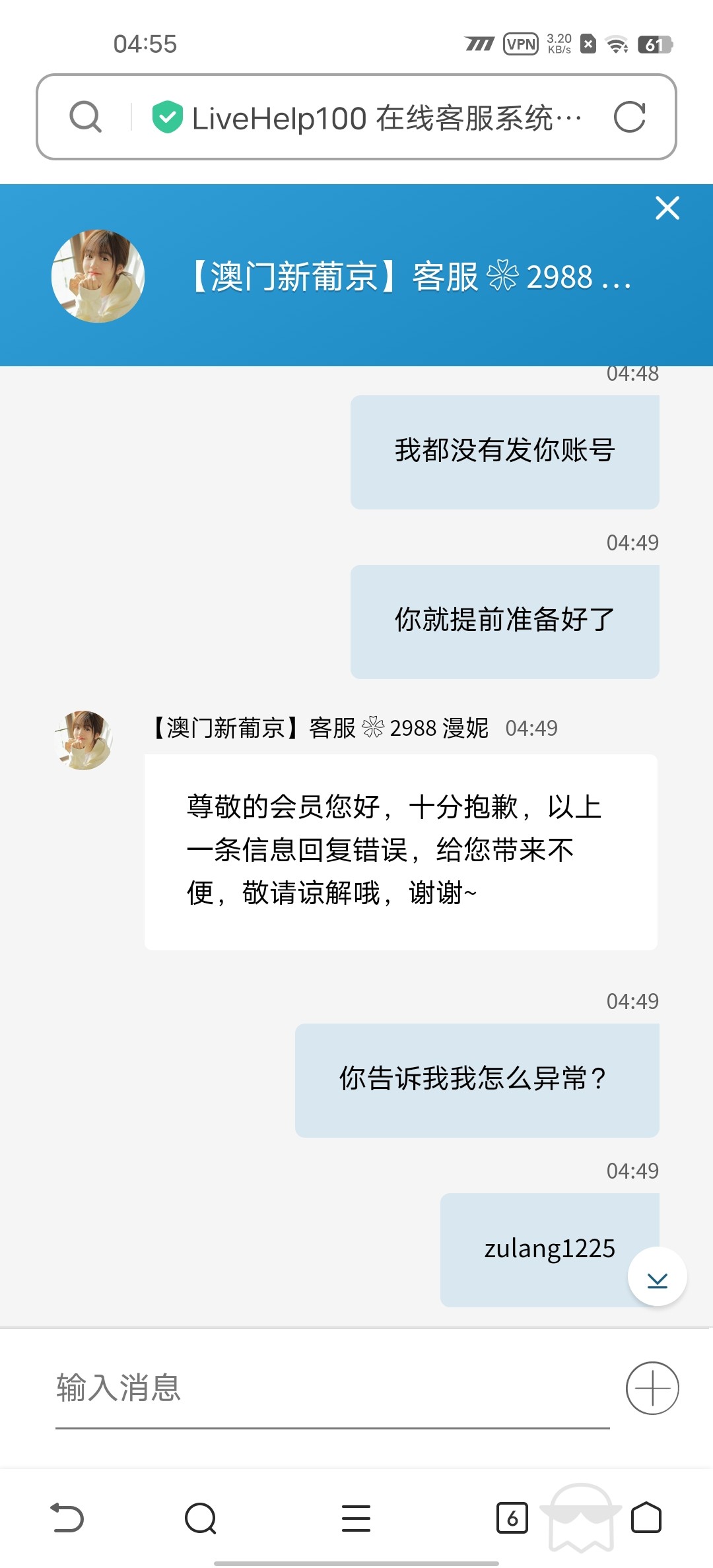 5157.com和2557.com两个平台都一家的,我充值100没有申请任何彩金,打上1000,就因为玩森林舞会追了长龙,赢了1000不给下款,直接扣了我盈利的900块钱,我没有给客户发账号,客户都提前准备好话术回复我了,各位小心这两个黑台,千万别充值,避雷了