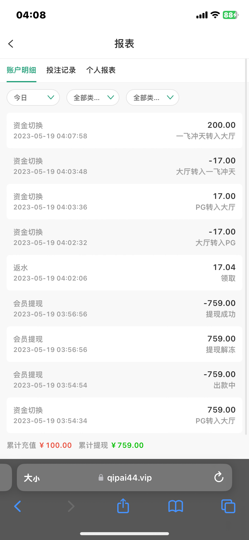 听你说有水 刚刚冲100 块钱,打麻将 才打 150 流水, 输完了